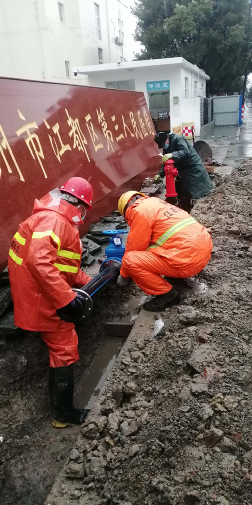 疫情就是命令,保供水就是責(zé)任。龍泉公司在接到緊急任務(wù)后,立即明確專人負(fù)責(zé),成立施工突擊隊(duì),并迅速派人赴區(qū)第三人民醫(yī)院擴(kuò)建工程現(xiàn)場(chǎng)實(shí)地查勘,向院方詳細(xì)了解擴(kuò)建工程供水需求、施工進(jìn)度安排等,并與院方共同研究,現(xiàn)場(chǎng)確定擴(kuò)建工程的接水方案。2月15日上午,搶修人員佩戴口罩、安全帽,進(jìn)行了體溫測(cè)量,冒著雨雪趕赴現(xiàn)場(chǎng),投入到緊張的施工工作中,由于前期施工方案細(xì)致、工作準(zhǔn)備充分,經(jīng)過(guò)10個(gè)小時(shí)的奮戰(zhàn),于當(dāng)天晚上8點(diǎn)順利完成了自來(lái)水管道的擴(kuò)建安裝任務(wù)。