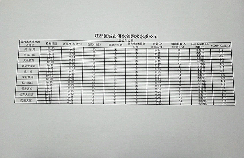 2017年12月江都區城市供水管網水水質公示