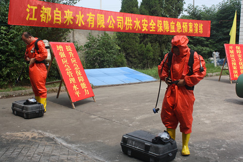 演練活動模擬液氯泄漏和突發(fā)性水源微污染場景,在液氯泄漏演練活動中,搶險人員接到報警后,立即趕到現場,穿戴好全套專用防護服,采用專用堵漏工具進行緊急排險堵漏,及時控制了險情。在突發(fā)性水源微污染現場,指揮長接到報告,下令立即啟動應急預案,各組分工協作,制水生產調度、取樣檢測、應對分析、組織應急投加等程序有條不紊地展開。