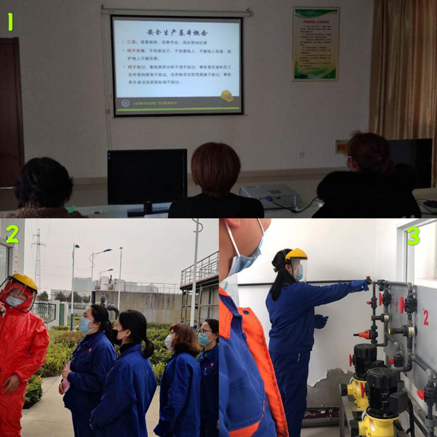 以邵伯污水廠為例,該廠結合自身工作實際,組織污水運營工學習次氯酸鈉的特性、消殺毒原理及如何正確使用防護裝備,熟練掌握次氯酸鈉發生泄漏時的各項應急處理措施,并在現場實施了一系列演練活動。另組織運營工赴小紀污水處理廠內觀看學習安全教育視頻,提高了員工安全防范意識及風險識別能力。