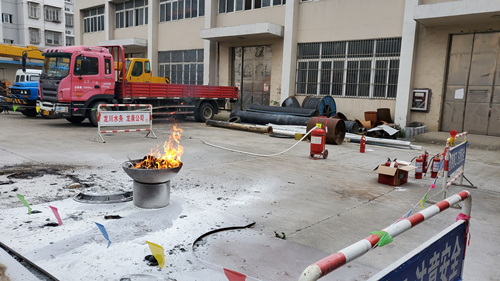 在演練前已做好前期準(zhǔn)備工作。在安全距離布置演練設(shè)圍擋、拉三角旗,畫定演練核心區(qū)域的警示線,同時在火點(diǎn)畫定安全距離園圈,保護(hù)演練人員的安全。