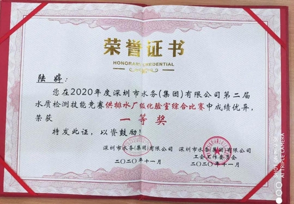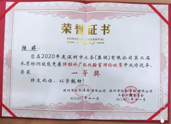 經過5天的激烈角逐,憑借著扎實的理論基礎、嫻熟的現場操作和默契的團隊合作,揚州龍川水務公司陸婷榮獲供排水廠級化驗室理論、綜合比賽“雙一等獎”,陸婷、于淼榮獲供排水廠級化驗室比賽團體二等獎。