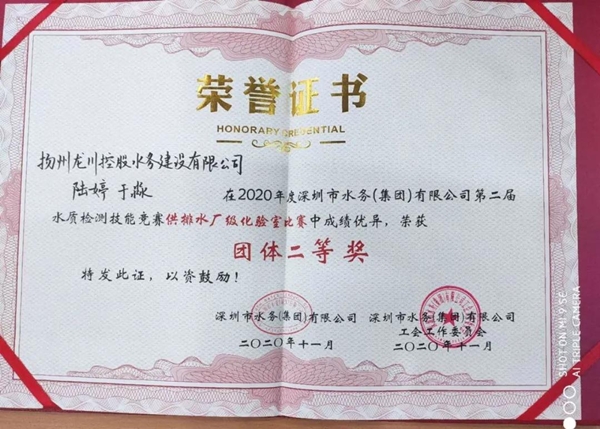 揚州龍川水務公司在深圳水務集團第二屆水質檢測技能競賽中斬獲嘉獎