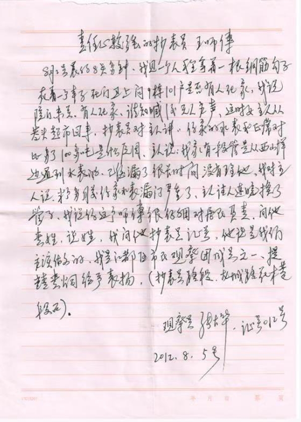 2012年8月5日,自來水公司收到一封來自江都市民觀察團成員的表揚信,信上寫著王梅富同志在一次日常工作中,發(fā)現(xiàn)有一用戶家中無人居住,嚴重漏水的問題,前后幾次往返鄰居和物業(yè)之間登記檢查,直至聯(lián)系上用戶,并確認用戶已將水表閥門關(guān)緊,不再漏水,才放心離開。事后王梅富同志只是說,這是他工作中很平常的一件小事,是自己應(yīng)盡的工作職責(zé)。