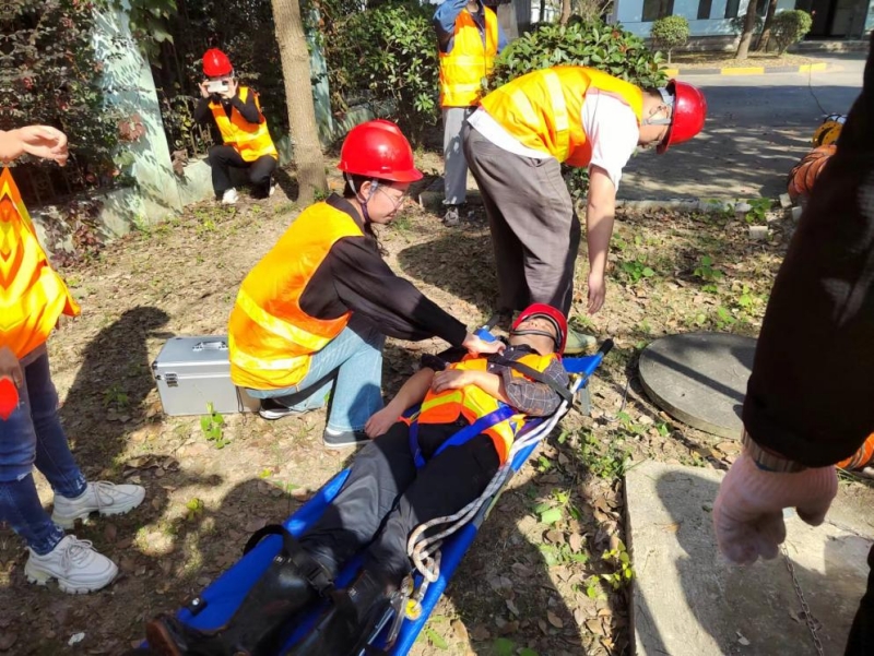現(xiàn)場(chǎng)后勤保障組放置救援三腳架、使用鼓風(fēng)機(jī)進(jìn)行通風(fēng)作業(yè),同時(shí)拉警戒線,疏散人員;搶修組穿戴救援繩、佩戴呼吸器、攜帶救援繩下井救人;救援組抬擔(dān)架、挎醫(yī)藥箱在閥門(mén)井口等待......現(xiàn)場(chǎng)演練緊張有序,隨著傷員被救出閥門(mén)井,放上擔(dān)架、轉(zhuǎn)移至通風(fēng)空曠處,展開(kāi)現(xiàn)場(chǎng)救護(hù)工作,直至救護(hù)人員到達(dá),此次演練活動(dòng)取得圓滿成功。