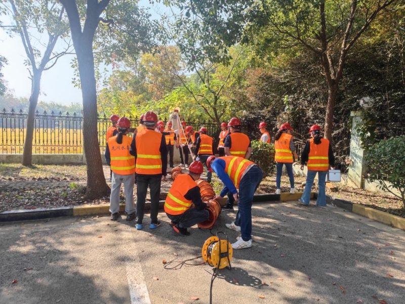 演練內(nèi)容為模擬有限空間事故發(fā)生在丁伙泵站進(jìn)水閥門(mén)井現(xiàn)場(chǎng),由于人員違章操作,在未經(jīng)審批的情況下,下井作業(yè)暈倒,情況十分危急,指揮組命令立即啟動(dòng)有限空間應(yīng)急搶修預(yù)案,各小組人員立即趕往現(xiàn)場(chǎng)進(jìn)行救援。